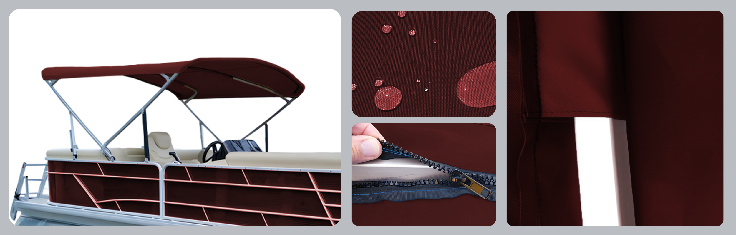 These wakeboard tower bimini tops are designed to mount within the confines of most wakeboard and ski towers to provide shade for the driver and spotter. All tops are 48" long and approximately 24" high (from mounting point) and are available in three different widths to fit most towers. The frame is constructed with bright dip anodized aluminum tubing using high-quality marine-grade hardware. The top features Marinex™ fabric for the best performance in strength, UV stability, and longevity. It is available in 7 popular colors (Black, Burgundy, Gray, Hunter Green, Navy, Royal Blue, White).