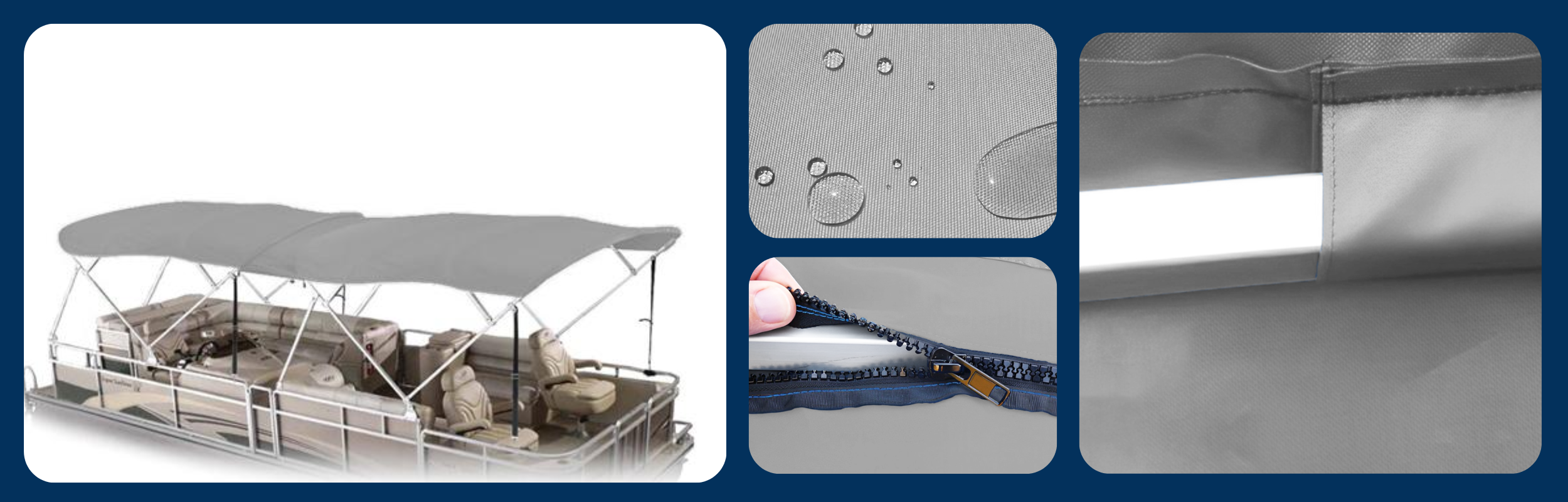 The tops will mount directly onto the tower frame at the center point, so pick the best position on the tower that will provide the most shade to the driver's seat. The tops are low profile with approximately a maximum height of 24", so be sure that the position will keep the top high enough to clear the driver and spotter when seated. Measure across the tower at the mounting point that has been selected and choose the dimensions from the chart, noting the wakeboard tower bimini width that matches your measured width on the tower. Check the width at the top and be sure that the angle of your tower will accommodate that dimension.